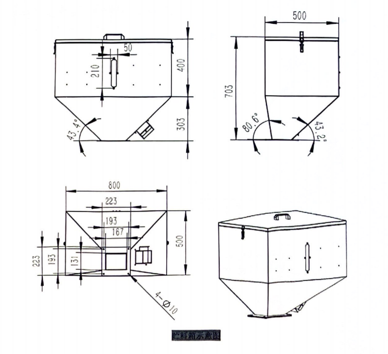 1.招标文件附件《贵州省密集烤房生物质颗粒燃料内置式燃烧机购置应用技术要求规范》“送料器”——“a)贮料箱”部分——“图5 贮料箱及档料板示意图”以下图为准: